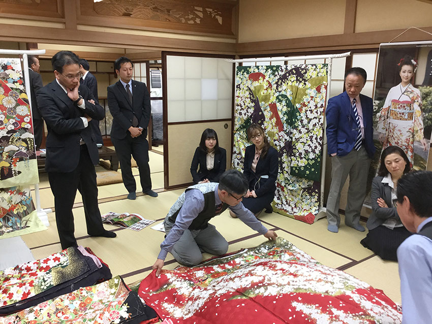 • 当然のことながら、お客様との会話は商談だけではありません。会話の幅を広げ、人柄を買っていただいてこそ、着物という高価なお買い物をしていただけるのです。年3回の研修旅行では、製品産地(京都・金沢・奄美大島等)を中心に、商品知識・製造過程等を学びます。また、美術館・博物館、由緒ある神社・仏閣をガイド付で見学し、感性を深めていきます。他にも、年7回の展示会前には全社員研修を実施。メーカー・商社の方から企画商品の基礎知識やより有効な販売戦略等を徹底して学びます。もちろん、週1回の営業研修、グループ研修、日々の実務内で身につけていくものも含め、全てがあなたを強く育ててくれるでしょう。